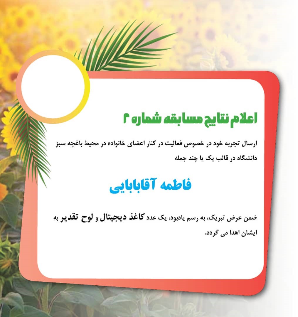 در پایان این جلسه از برگزیدگان دو مسابقه "برترین باغچه سبز" و "ارسال تجربه خود از باغچه سبز" با اهدای جوایز و لوح یادبود، تقدیر به عمل آمد.